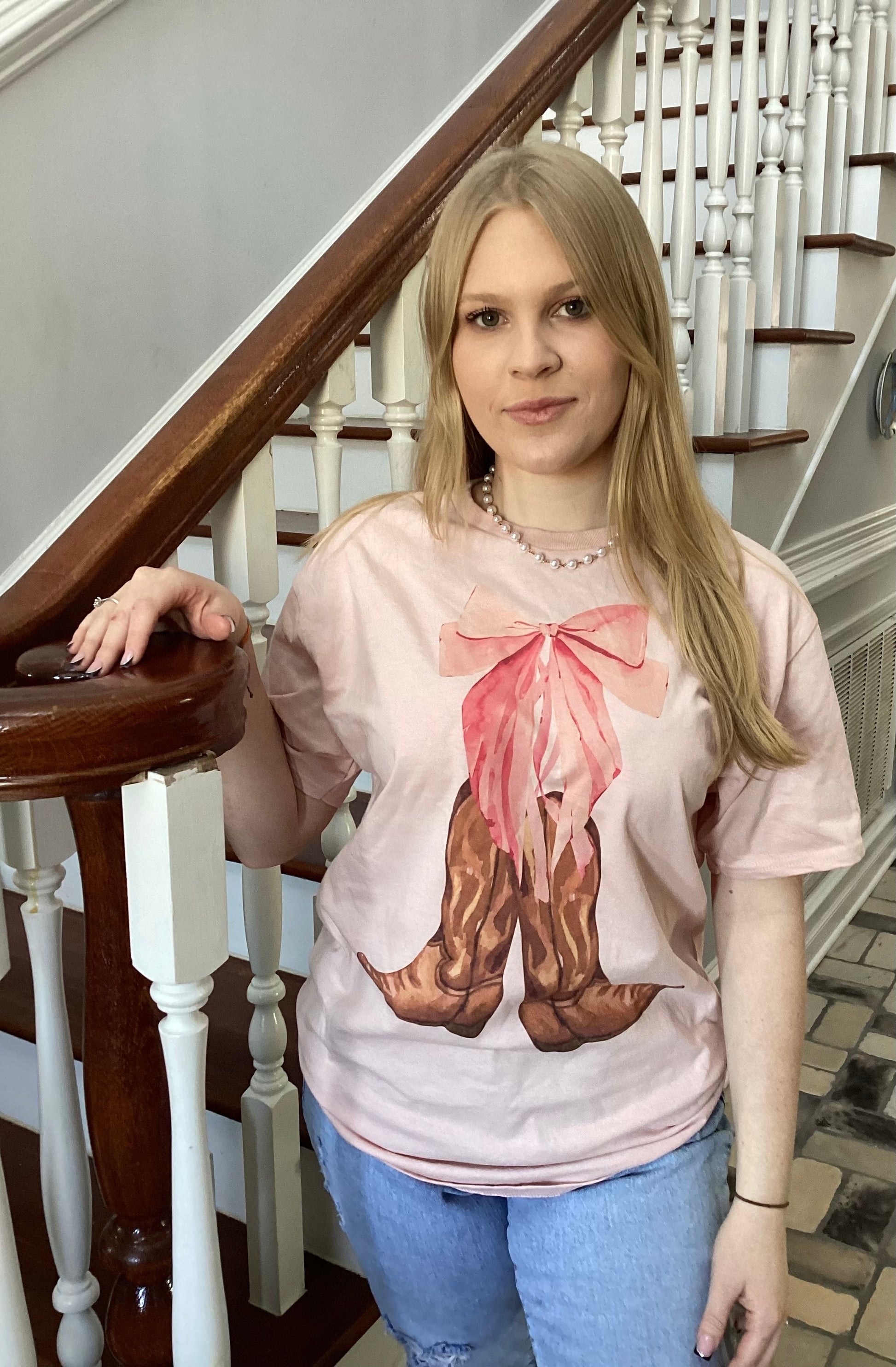 This graphic t-shirt’s design features a pink ribbon bow above a pair of cowboy boots. This top is perfect for anytime you want to show your playful, romantic side!